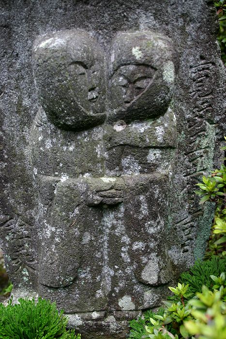 金剛寺と同じ「お高祖頭巾」を被った道祖神は県内に数基しか無い。その中で、宮城地内に二基、鼻毛石の「お帰り道祖神」がそれである。その他、粕川町月田に相合傘を差した姿の道祖神がある。これは、向かって右側の男性が、お高祖頭巾を被っていない。金剛寺より少し前の寛政元年2月作である。右側に天下泰平国土安穏と刻んである。天明の飢饉が過ぎ、2年前から松平定信の寛政の改革が始まるその時である。皆、天下泰平を願ったのであろう。その他、粕川町室沢の全徳寺に明和3年(1766年)7月銘のがある。これは、何か深く抱き合い真に迫っている…??姿に感じられる。互いの肩に掛かっている手に力が籠もっている様な…。この明和と言う年も、決して安寧な年では無かった様である。明和元年には秩父で百姓一揆が起きたり、前橋城下で大火が起き、600戸余が消失すると言う騒然とした時代であったと言う。金剛寺の石仏が造立された27年前である。